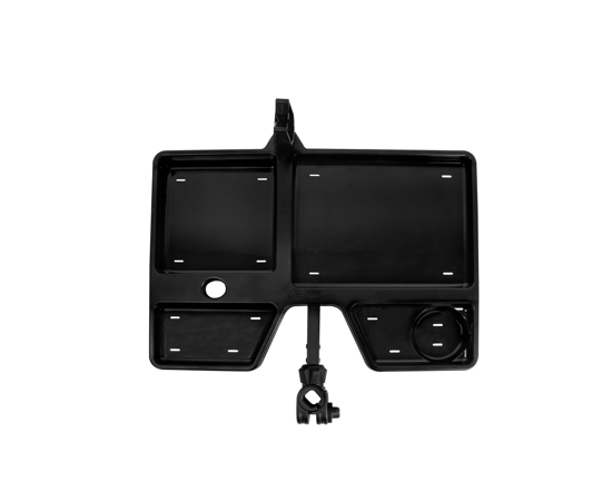 Das Allrounder Side Tray bietet zahlreiche Funktionen. Es verfügt über Vertiefungen für BLOX-Boxen und Köderdosen, einen Becherhalter, einen Katapultschlitz sowie ein integriertes Rig Rack zur Aufbewahrung von Vorfächern.