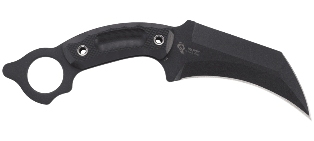 Austin beschreibt seine Messer selbst als black, undecorated and ugly, also schwarz, schmucklos und hässlich – nur zum Gebrauch gemacht. Alles ist matt-schwarz, die Formen massiv und funktional. Die Klinge des Du Hoc besteht aus SK5-Kohlenstoffstahl. Diese Stahlsorte ist sehr zäh und einfach zu schärfen. Sie ist nicht vollständig rostfrei, wird aber durch die matte Beschichtung geschützt. Die Form entspricht einem Hawkbill, wie man es von einem Karambit erwartet. Die Klingenspitze ist bereits geschärft, der Rest des Klingenrückens ist dünn gehalten, sodass der Nutzer sie später auch schärfen könnte.