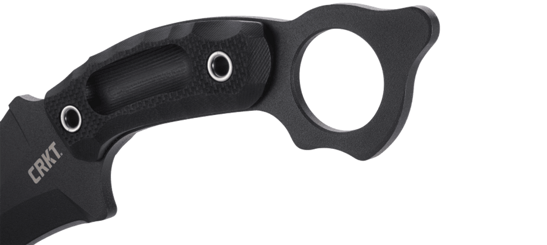 Am Ende des Griffs befindet sich ein großer Fingerring, den man mit dem kleinen Finger oder dem Zeigefinger nutzen kann – je nach gewünschtem Griffstil. Während viele Karambit-Designer die Ringe so konstruieren, dass man das Messer schnell in der Hand drehen kann, hat McGlaun bewusst Ausbuchtungen angebracht, die dem Benutzer den richtigen Griff zeigen und verhindern, dass das Messer unkontrolliert in der Hand rotiert.