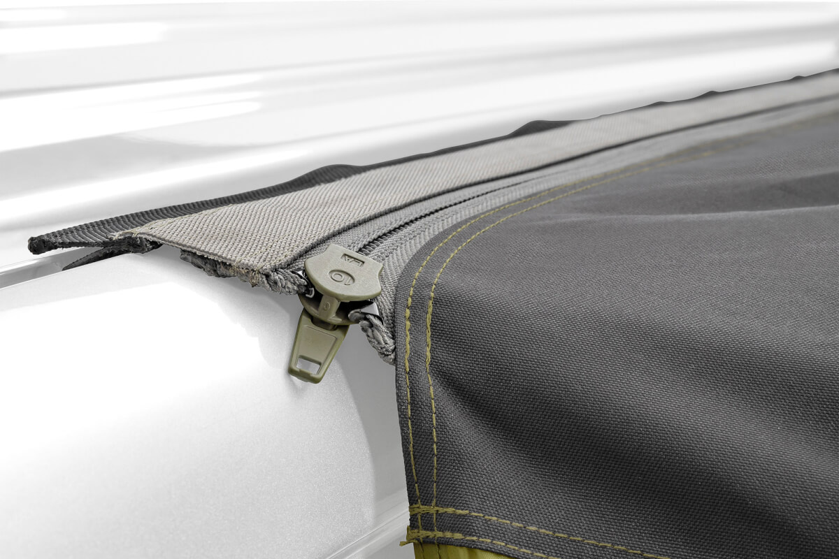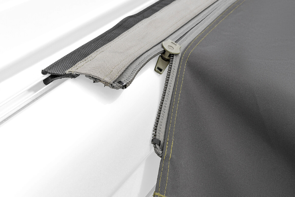 Das Vorzelt bietet Stehhöhe, einen separaten Moskitonetz-Eingang und eine Fronttür, die aufrollbar oder als Sonnendach nutzbar ist. Der Fahrzeuganschluss kann abgezippt werden, sodass das Zelt auch allein stehen kann.