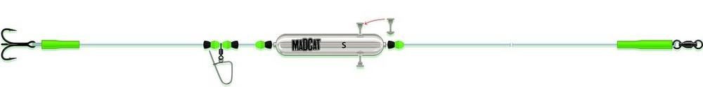 Increase your success rate on fast-flowing waters with this rig, designed for use with the MADCAT Adjustable Subfloat to present a baitfish. The key advantage of the nose clip is that the catfish will always hook itself on the treble hook—unlike traditional nose hooks—resulting in a significantly higher hook-up rate. Tied with 1.30 mm thick MADCAT Ultra-Soft mono leader. The total rig length is 250 cm, with a breaking strain of 165 lb.