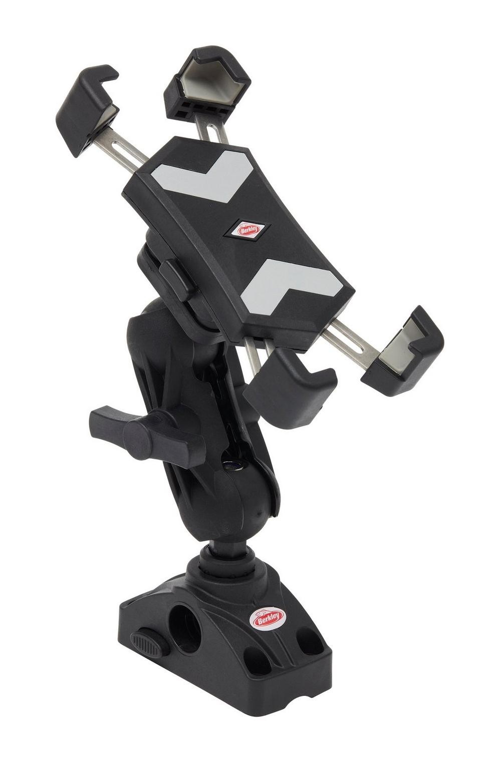 Completely safe holder for a smartphone or other small mobile device, mounted on a Berkley Ball Mounting System. Supplied with the Berkley Mount Base with Lock. Push your device into the spring-loaded arms, which automatically lock it in place. Soft rubber pads on each arm provide a secure grip without scratching.