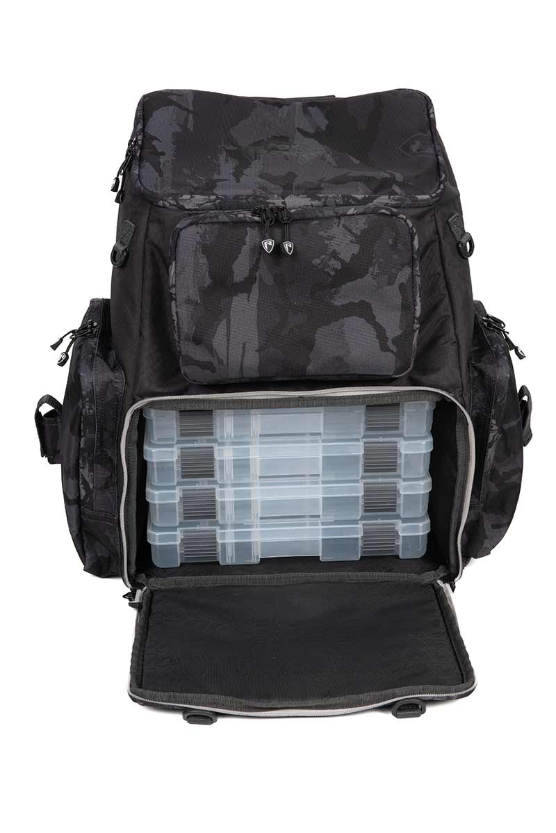 rugzak, roofvistas, kunstaasrugzak, tackle boxes, vistools opbergvak, D-ring, fox rage camo, waterdichte bodem, dubbele zijvakken