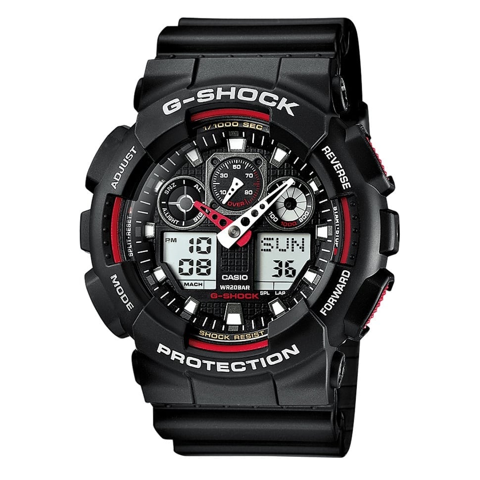 Casio, G-Shock, GA-100, red accents, analog digital, shock resistant, antimagnetic, 1/1000 stopwatch, 20 bar waterdicht, resin strap, sporthorloge