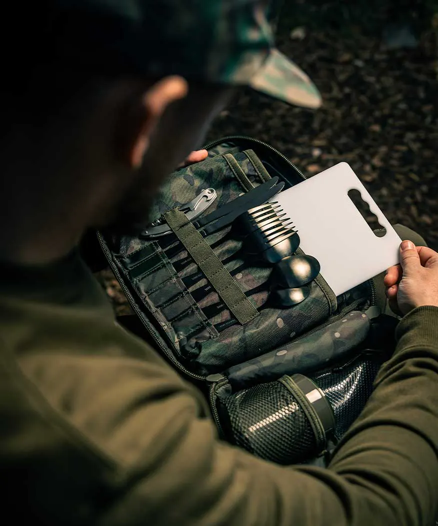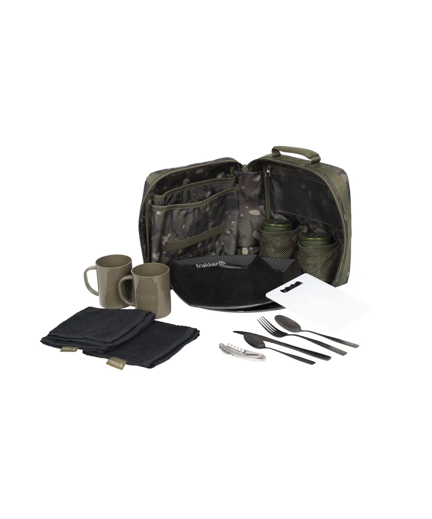De set bevat twee messen, twee vorken, twee eetlepels, één theelepel, twee vierkante borden, twee bekers, twee groene Glug Pots (ideaal voor thee, koffie, suiker of kruiden), twee theedoeken, één flesopener en één snijplank. Elk onderdeel heeft zijn eigen vaste plek binnenin de tas, zodat alles netjes georganiseerd blijft. Binnenin bevindt zich bovendien een stevig meshvak met rits voor extra opbergruimte, perfect geschikt voor bijvoorbeeld het Trakker Armolife Silicone Utensil Set.