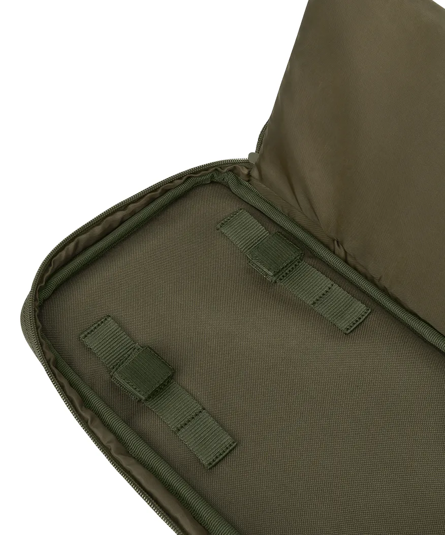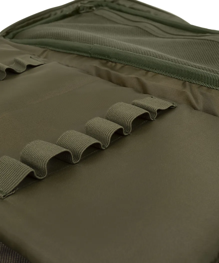 Aan de binnenzijde bevindt zich een ritsvak voor accessoires zoals reservebatterijen en swingers of hangers. De verstelbare bevestigingsbanden zorgen ervoor dat verschillende maten buzzer bars stevig vastzitten. Een gevoerde scheidingsplaat voorkomt dat de beetmelders in contact komen met andere onderdelen, terwijl de achterkant van deze plaat is voorzien van elastische lussen voor het opbergen van zes banksticks.