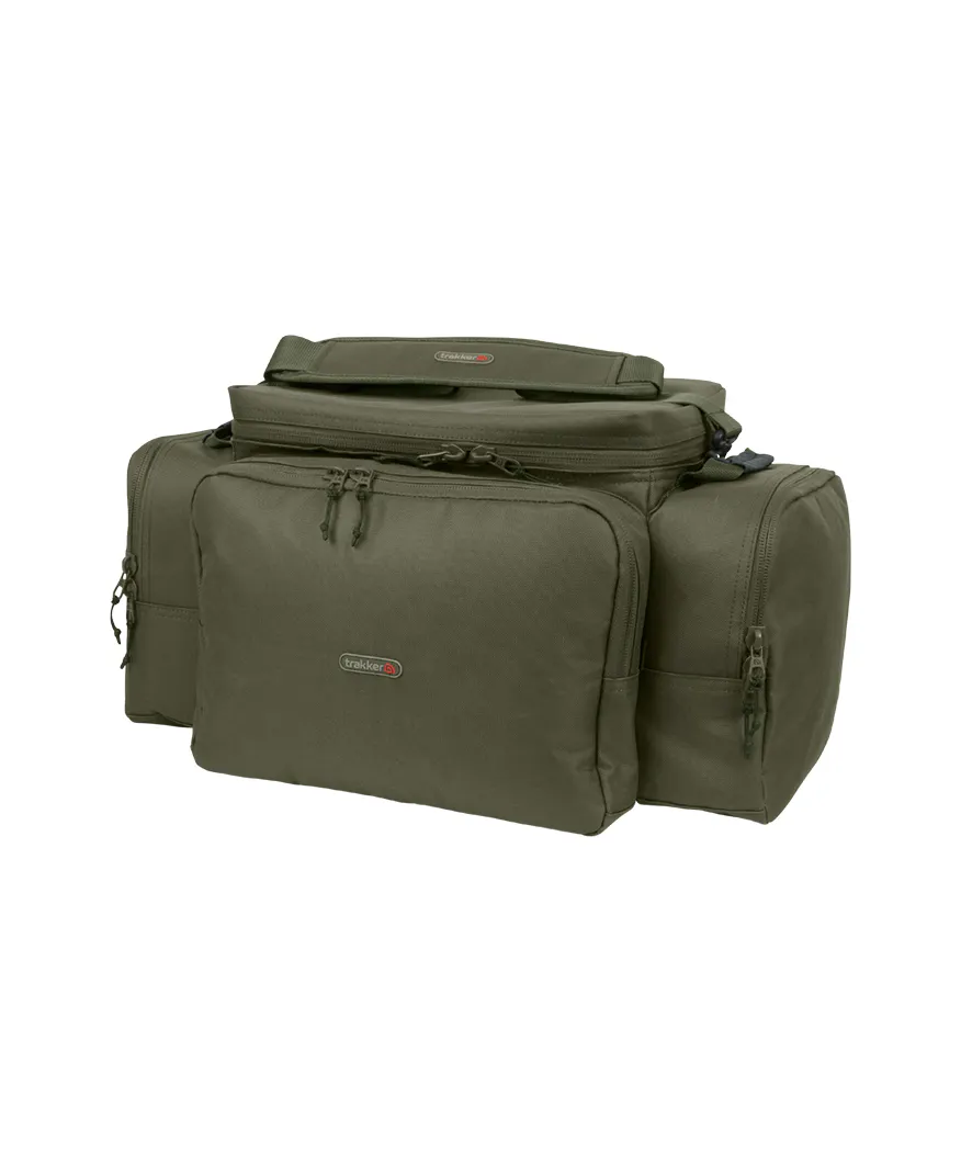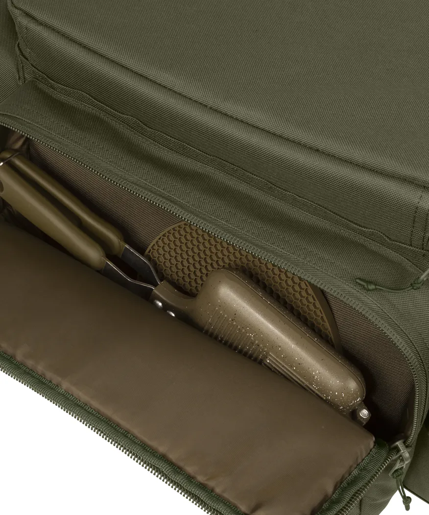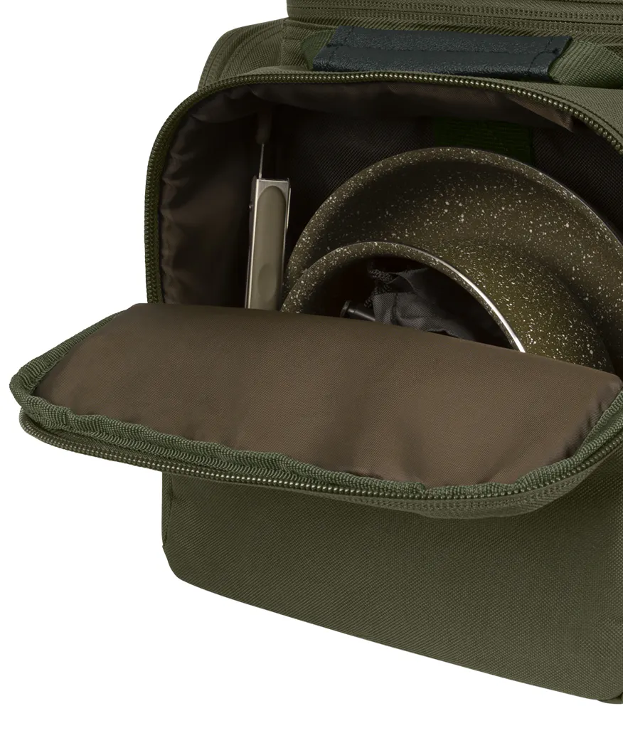Het grote voorvak met ritssluiting bevat een éénpersoons bestekset met alles wat je nodig hebt aan de waterkant. Daarnaast zijn er gevoerde verdelers die perfect passen bij de Trakker Armolife Sandwich Toaster en de Armolife Marble Pannen (Compact en Medium). Het achtervak is identiek, maar zonder bestekset, ideaal voor extra kook- of eetbenodigdheden.